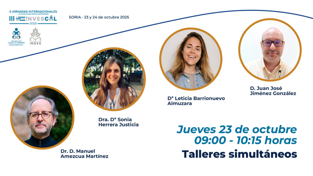 Estos talleres simultáneos tendrán lugar de el jueves 23 de octubre de 9:00h a 10:15 horas en el Aula Magna Tirso de Molina de la Diputación Provincial de Soria, dentro de las Jornadas Internacionales de Investigación en Enfermería Invescol 2025, que este año llevan el tema “Envejecimiento y Cronicidad: “Transferencia del conocimiento ante desafíos globales”, y están organizadas por el Consejo de Colegios Oficiales de Enfermería de Castilla y León junto con la Fundación Index. Consulta el programa completo aquí.