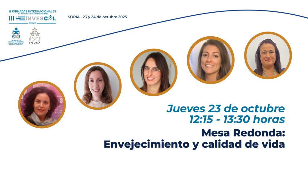 Mesa redonda: envejecimiento y calidad de vidaSoria, 23 y 24 de octubre de 2025 La primera mesa redonda de las II Jornadas Internacionales de Investigación en Enfermería Invescol tratará el tema “Envejecimiento y calidad de vida” y estará moderada por Dª Patricia Pérez Andrés, Grado en Enfermería, Especialista en Enfermería Familiar y Comunitaria, y Presidenta